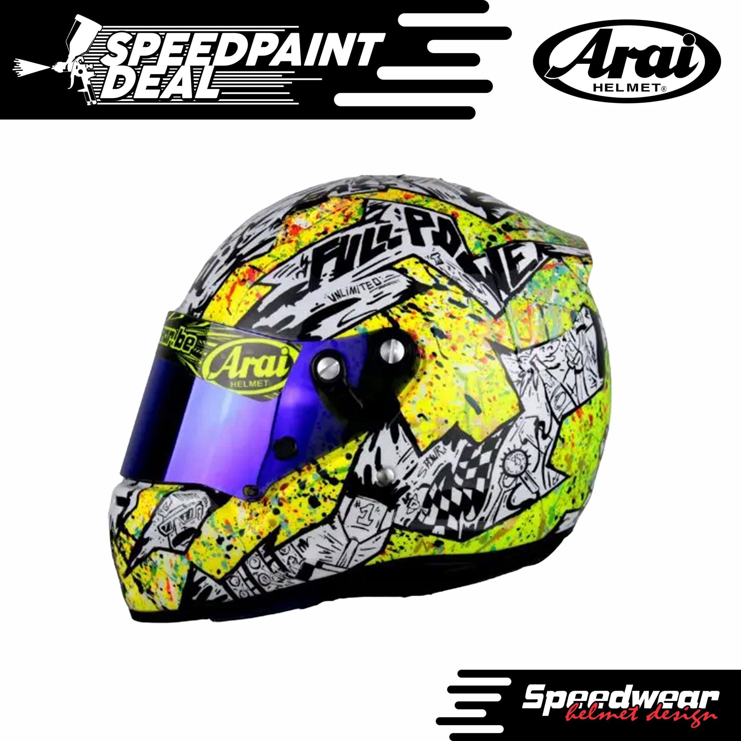 De SpeedPaint Deal CARTOON omvat een uniek design, professionele helmspuiting en een keuze uit een Arai of Schuberth helm. Wil je snel een helm met een opvallende uitstraling? Dan is deze deal perfect voor jou!